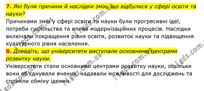 7. Які були причини й наслідки змін, що відбулися у сфері освіти та науки? Причинами змін у сфері освіти та науки були прогресивні ідеї, потреби суспільства та вплив модернізаційних процесів. Наслідки включали покращення рівня освіти, розвиток науки та підвищення культурного рівня населення. 8. Доведіть, що університети виступали основними центрами розвитку науки. Університети стали основними центрами розвитку науки, оскільки вони об'єднували вчених, надавали можливості для досліджень та сприяли обміну ідеями.