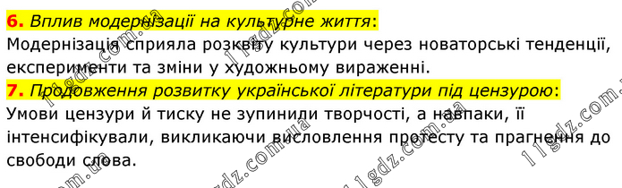 6. Вплив модернізації на культурне життя: Модернізація сприяла розквіту культури через новаторські тенденції, експерименти та зміни у художньому вираженні. 7. Продовження розвитку української літератури під цензурою: Умови цензури й тиску не зупинили творчості, а навпаки, її інтенсифікували, викликаючи висловлення протесту та прагнення до свободи слова.