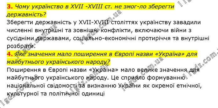 3. Чому українство в ХVII -ХVIII ст. не змогло зберегти державність? Зберегти державність у XVII-XVIII століттях українству завадили численні внутрішні та зовнішні конфлікти, включаючи війни з сусідніми державами, соціально-економічні протиріччя та внутрішні розбрати. 4. Яке значення мало поширення в Європі назви «Україна» для майбутнього українського народу? Поширення в Європі назви «Україна» мало велике значення для майбутнього українського народу. Це сприяло формуванню національної свідомості та визнанню України як окремої етнічної, культурної та політичної одиниці