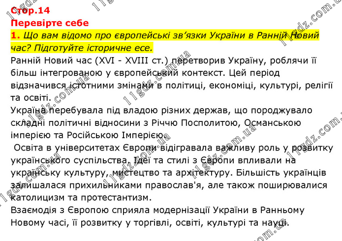 Перевірте себе 1. Що вам відомо про європейські зв’язки України в Ранній Новий час? Підготуйте історичне есе. Ранній Новий час (XVI - XVIII ст.) перетворив Україну, роблячи її більш інтегрованою у європейський контекст. Цей період відзначився істотними змінами в політиці, економіці, культурі, релігії та освіті. Україна перебувала під владою різних держав, що породжувало складні політичні відносини з Річчю Посполитою, Османською імперією та Російською Імперією. Освіта в університетах Європи відігравала важливу роль у розвитку українського суспільства. Ідеї та стилі з Європи впливали на українську культуру, мистецтво та архітектуру. Більшість українців залишалася прихильниками православ'я, але також поширювалися католицизм та протестантизм. Взаємодія з Європою сприяла модернізації України в Ранньому Новому часі, її розвитку у торгівлі, освіті, культурі та науці.
