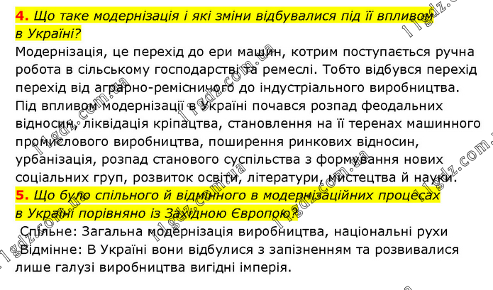4. Що таке модернізація і які зміни відбувалися під її впливом в Україні? Модернізація, це перехід до ери машин, котрим поступається ручна робота в сільському господарстві та ремеслі. Тобто відбувся перехід перехід від аграрно-ремісничого до індустріального виробництва. Під впливом модернізації в Україні почався розпад феодальних відносин, ліквідація кріпацтва, становлення на її теренах машинного промислового виробництва, поширення ринкових відносин, урбанізація, розпад станового суспільства з формування нових соціальних груп, розвиток освіти, літератури, мистецтва й науки. 5. Що було спільного й відмінного в модернізаційних процесах в Україні порівняно із Західною Європою? Спільне: Загальна модернізація виробництва, національні рухи Відмінне: В Україні вони відбулися з запізненням та розвивалися лише галузі виробництва вигідні імперія.