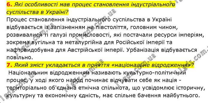 6. Які особливості мав процес становлення індустріального суспільства в Україні? Процес становлення індустріального суспільства в Україні відбувається із запізненням на півстоліття, головним чином, розвивалися ті галузі промисловості, які постачали ресурси імперіям, зокрема вугільна та металургійна для Російської імперії та нафтовидобувна для Австрійської імперії. Урбанізація відбувається повільно. 7. Який зміст укладається в поняття «національне відродження»? Національним відродженням називають культурно-політичний процес, у ході якого народ починає відчувати себе як нація - територіально об'єднана етнічна спільнота, що усвідомлює історичну, культурну та економічну єдність, має спільне бачення майбутнього.