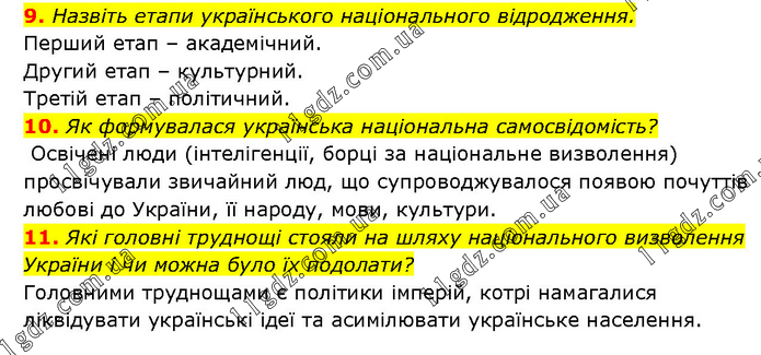 9. Назвіть етапи українського національного відродження. Перший етап – академічний. Другий етап – культурний. Третій етап – політичний. 10. Як формувалася українська національна самосвідомість? Освічені люди (інтелігенції, борці за національне визволення) просвічували звичайний люд, що супроводжувалося появою почуттів любові до України, її народу, мови, культури. 11. Які головні труднощі стояли на шляху національного визволення України і чи можна було їх подолати? Головними труднощами є політики імперій, котрі намагалися ліквідувати українські ідеї та асимілювати українське населення.