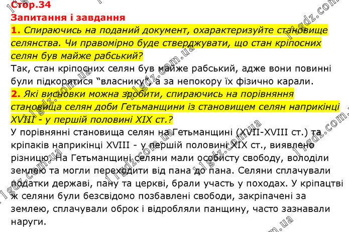 Стор.34 Запитання і завдання 1. Спираючись на поданий документ, охарактеризуйте становище селянства. Чи правомірно буде стверджувати, що стан кріпосних селян був майже рабський? Так, стан кріпосних селян був майже рабський, адже вони повинні були підкорятися “власнику”, а за непокору їх фізично карали. 2. Які висновки можна зробити, спираючись на порівняння становища селян доби Гетьманщини із становищем селян наприкінці ХVІІІ - у першій половині ХІХ ст.? У порівнянні становища селян на Гетьманщині (XVII-XVIII ст.) та кріпаків наприкінці XVIII - у першій половині XIX ст., виявлено різницю. На Гетьманщині селяни мали особисту свободу, володіли землею та могли переходити від пана до пана. Селяни сплачували податки державі, пану та церкві, брали участь у походах. У кріпацтві ж селяни були безсвідомо позбавлені свободи, закріпачені за землею, сплачували оброк і відробляли панщину, часто зазнавали наруги.