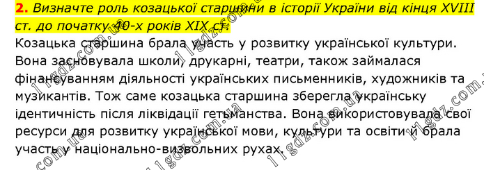 2. Визначте роль козацької старшини в історії України від кінця XVIII ст. до початку 40-х років XIX ст. Козацька старшина брала участь у розвитку української культури. Вона засновувала школи, друкарні, театри, також займалася фінансуванням діяльності українських письменників, художників та музикантів. Тож саме козацька старшина зберегла українську ідентичність після ліквідації гетьманства. Вона використовувала свої ресурси для розвитку української мови, культури та освіти й брала участь у національно-визвольних рухах.