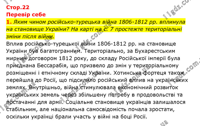 Стор.22 Перевір себе 1. Яким чином російсько-турецька війна 1806-1812 рр. вплинула на становище України? На карті на с. 7 простежте територіальні зміни після війни. Вплив російсько-турецької війни 1806-1812 рр. на становище України був багатогранним. Територіально, за Бухарестським мирним договором 1812 року, до складу Російської імперії була приєднана Бессарабія, що призвело до змін у територіальному розміщенні і етнічному складі України. Хотинська фортеця також перейшла до Росії, що підсилило російський вплив на українських землях. Внутрішньо, війна стимулювала економічний розвиток українських земель через збільшену потребу в продовольстві та постачанні для армії. Соціальне становище українців залишалося стабільним, але національна самосвідомість почала зростати, оскільки українці брали участь у війні на боці Росії.