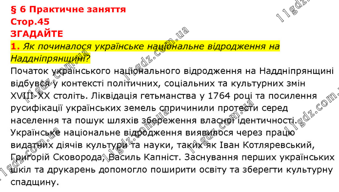 § 6 Практичне заняття Стор.45 ЗГАДАЙТЕ 1. Як починалося українське національне відродження на Наддніпрянщині? Початок українського національного відродження на Наддніпрянщині відбувся у контексті політичних, соціальних та культурних змін XVIII-XX століть. Ліквідація гетьманства у 1764 році та посилення русифікації українських земель спричинили протести серед населення та пошук шляхів збереження власної ідентичності. Українське національне відродження виявилося через працю видатних діячів культури та науки, таких як Іван Котляревський, Григорій Сковорода, Василь Капніст. Заснування перших українських шкіл та друкарень допомогло поширити освіту та зберегти культурну спадщину.