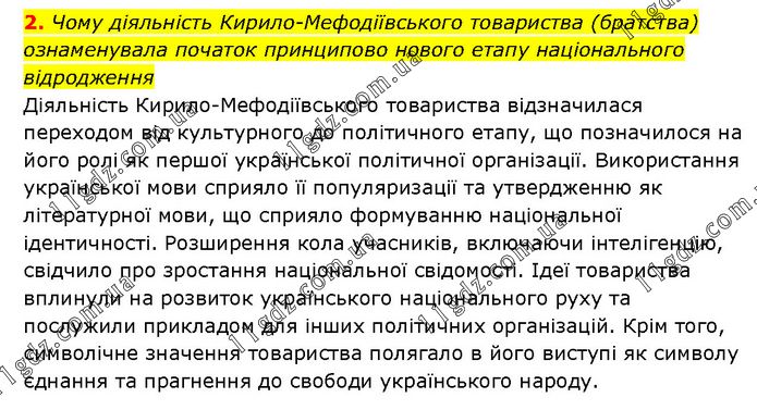 2. Чому діяльність Кирило-Мефодіївського товариства (братства) ознаменувала початок принципово нового етапу національного відродження Діяльність Кирило-Мефодіївського товариства відзначилася переходом від культурного до політичного етапу, що позначилося на його ролі як першої української політичної організації. Використання української мови сприяло її популяризації та утвердженню як літературної мови, що сприяло формуванню національної ідентичності. Розширення кола учасників, включаючи інтелігенцію, свідчило про зростання національної свідомості. Ідеї товариства вплинули на розвиток українського національного руху та послужили прикладом для інших політичних організацій. Крім того, символічне значення товариства полягало в його виступі як символу єднання та прагнення до свободи українського народу.