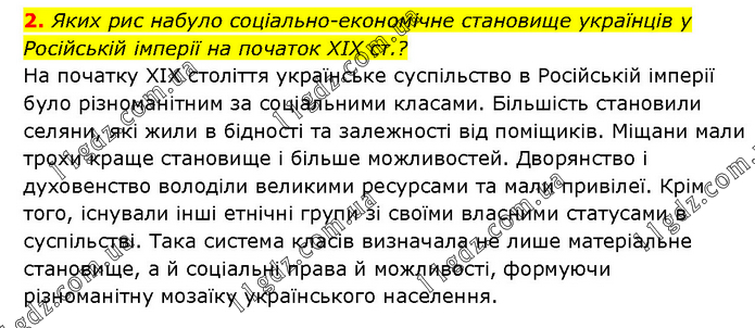2. Яких рис набуло соціально-економічне становище українців у Російській імперії на початок XIX ст.? На початку XIX століття українське суспільство в Російській імперії було різноманітним за соціальними класами. Більшість становили селяни, які жили в бідності та залежності від поміщиків. Міщани мали трохи краще становище і більше можливостей. Дворянство і духовенство володіли великими ресурсами та мали привілеї. Крім того, існували інші етнічні групи зі своїми власними статусами в суспільстві. Така система класів визначала не лише матеріальне становище, а й соціальні права й можливості, формуючи різноманітну мозаїку українського населення.