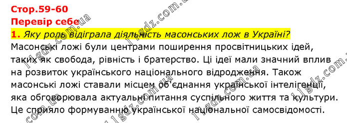 Перевір себе 1. Яку роль відіграла діяльність масонських лож в Україні? Масонські ложі були центрами поширення просвітницьких ідей, таких як свобода, рівність і братерство. Ці ідеї мали значний вплив на розвиток українського національного відродження. Також масонські ложі ставали місцем об'єднання української інтелігенції, яка обговорювала актуальні питання суспільного життя та культури. Це сприяло формуванню української національної самосвідомості.