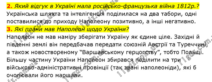 2. Який відгук в Україні мала російсько-французька війна 1812р.? Українська шляхта та інтелігенція поділилася на два табори, одні поставилися до приходу Наполеону позитивно, а інші негативно. 3. Які плани мав Наполеон щодо України? Наполеон не мав наміру зберігати Україну як єдине ціле. Західні й південні землі він передбачав передати союзній Австрії та Туреччині, а також новоствореному “Варшавському герцогству”, тобто Польщі. Більшу частину України Наполеон збирався поділити на три військово-адміністративні провінції (так звані наполеоніди), які б очолювали його маршали.