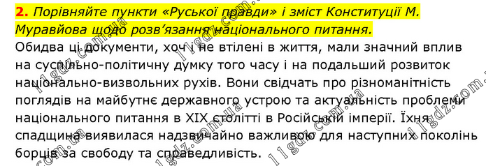 Порівняйте пункти «Руської правди» і зміст Конституції М. Муравйова щодо розв’язання національного питання. Обидва ці документи, хоч і не втілені в життя, мали значний вплив на суспільно-політичну думку того часу і на подальший розвиток національно-визвольних рухів. Вони свідчать про різноманітність поглядів на майбутнє державного устрою та актуальність проблеми національного питання в XIX столітті в Російській імперії. Їхня спадщина виявилася надзвичайно важливою для наступних поколінь борців за свободу та справедливість.