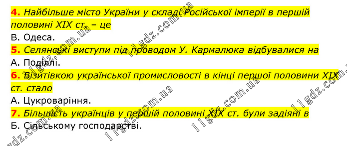 4. Найбільше місто України у складі Російської імперії в першій половині ХІХ ст. – це В. Одеса. 5. Селянські виступи під проводом У. Кармалюка відбувалися на А. Поділлі. 6. Візитівкою української промисловості в кінці першої половини ХІХ ст. стало А. Цукроваріння. 7. Більшість українців у першій половині ХІХ ст. були задіяні в Б. Сільському господарстві.