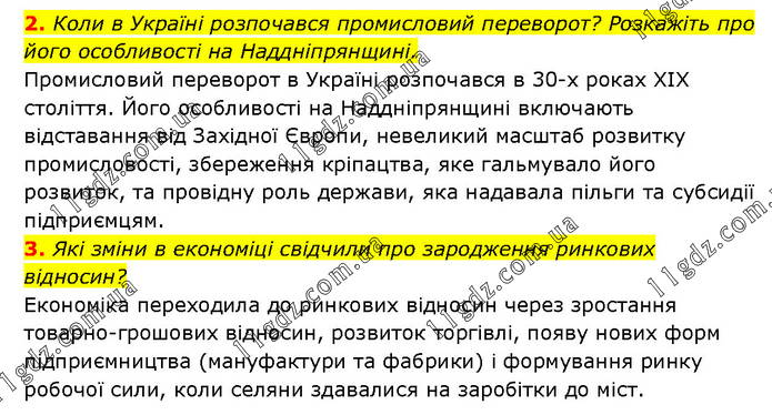 2. Коли в Україні розпочався промисловий переворот? Розкажіть про його особливості на Наддніпрянщині. Промисловий переворот в Україні розпочався в 30-х роках XIX століття. Його особливості на Наддніпрянщині включають відставання від Західної Європи, невеликий масштаб розвитку промисловості, збереження кріпацтва, яке гальмувало його розвиток, та провідну роль держави, яка надавала пільги та субсидії підприємцям. 3. Які зміни в економіці свідчили про зародження ринкових відносин? Економіка переходила до ринкових відносин через зростання товарно-грошових відносин, розвиток торгівлі, появу нових форм підприємництва (мануфактури та фабрики) і формування ринку робочої сили, коли селяни здавалися на заробітки до міст.