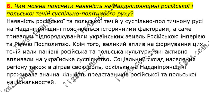 Чим можна пояснити наявність на Наддніпрянщині російської і польської течій суспільно-політичного руху? Наявність російської та польської течій у суспільно-політичному русі на Наддніпрянщині пояснюється історичними факторами, а саме тривалим підпорядкуванням українських земель Російською імперією та Реччю Посполитою. Крім того, великий вплив на формування цих течій мали панівні російська та польська культури, які активно впливали на українське суспільство. Соціальний склад населення регіону також відіграв свою роль, оскільки на Наддніпрянщині проживала значна кількість представників російської та польської національностей.