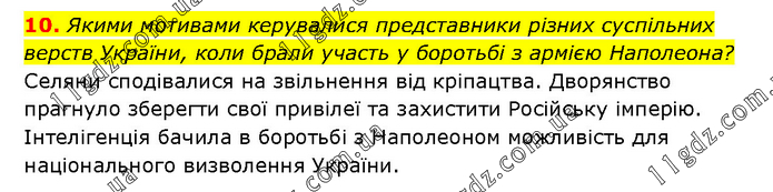Якими мотивами керувалися представники різних суспільних верств України, коли брали участь у боротьбі з армією Наполеона? Селяни сподівалися на звільнення від кріпацтва. Дворянство прагнуло зберегти свої привілеї та захистити Російську імперію. Інтелігенція бачила в боротьбі з Наполеоном можливість для національного визволення України.
