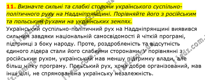 Визначте сильні та слабкі сторони українського суспільно-політичного руху на Наддніпрянщині. Порівняйте його з російським та польським рухами на українських землях. Український суспільно-політичний рух на Наддніпрянщині виявився сильним завдяки національній самосвідомості й чіткій програмі, підтримці з боку народу. Проте, роздробленість та відсутність єдиного лідера стали його слабкими сторонами. У порівнянні з російським рухом, український мав меншу підтримку влади, але більш чітку програму. Польський рух, хоча добре організований, мав інші цілі, не спрямовані на українську незалежність.