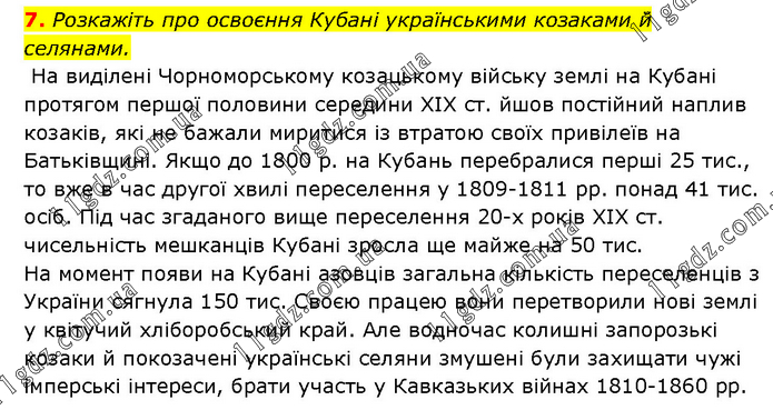 7. Розкажіть про освоєння Кубані українськими козаками й селянами. На виділені Чорноморському козацькому війську землі на Кубані протягом першої половини середини ХІХ ст. йшов постійний наплив козаків, які не бажали миритися із втратою своїх привілеїв на Батьківщині. Якщо до 1800 р. на Кубань перебралися перші 25 тис., то вже в час другої хвилі переселення у 1809-1811 рр. понад 41 тис. осіб. Під час згаданого вище переселення 20-х років ХІХ ст. чисельність мешканців Кубані зросла ще майже на 50 тис. На момент появи на Кубані азовців загальна кількість переселенців з України сягнула 150 тис. Своєю працею вони перетворили нові землі у квітучий хліборобський край. Але водночас колишні запорозькі козаки й покозачені українські селяни змушені були захищати чужі імперські інтереси, брати участь у Кавказьких війнах 1810-1860 pp.