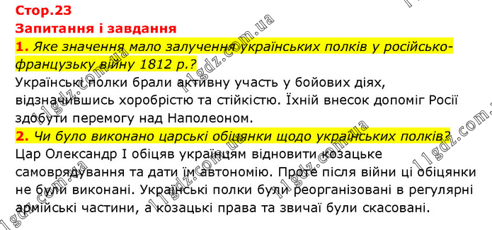 Стор.23 Запитання і завдання 1. Яке значення мало залучення українських полків у російсько- французьку війну 1812 р.? Українські полки брали активну участь у бойових діях, відзначившись хоробрістю та стійкістю. Їхній внесок допоміг Росії здобути перемогу над Наполеоном. 2. Чи було виконано царські обіцянки щодо українських полків? Цар Олександр I обіцяв українцям відновити козацьке самоврядування та дати їм автономію. Проте після війни ці обіцянки не були виконані. Українські полки були реорганізовані в регулярні армійські частини, а козацькі права та звичаї були скасовані.