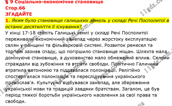 § 9 Соціально-економічне становище Стор.66 ЗГАДАЙТЕ 1. Яким було становище галицьких земель у складі Речі Посполитої в останні десятиліття її існування? У кінці 17-18 століть Галицькі землі у складі Речі Посполитої переживали економічний занепад через жорстоку експлуатацію селян у панщині та фільварковій системі. Розвиток ремесел та торгівлі зазнав спаду, що погіршило становище міщан. Шляхта мала домінуюче становище, а духовенство мало обмежений вплив. Селяни страждали від зубожіння та втрати свободи. Політично Галичина втратила автономію та піддавалася полонізації. Релігійно спостерігалася полонізація та переслідування українського православ'я. Культурно відбувався занепад, але збереження української мови та традицій завдяки братствам. Загалом, це був період тяжкої боротьби українського населення за свої права та свободи.
