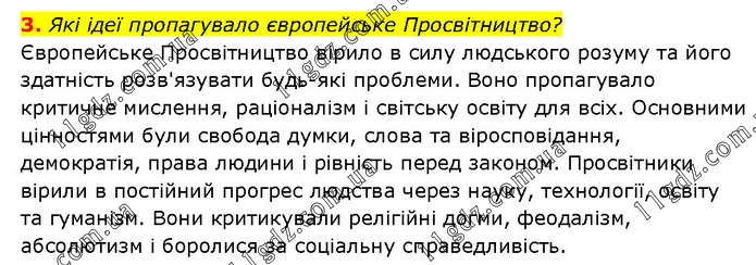 3. Які ідеї пропагувало європейське Просвітництво? Європейське Просвітництво вірило в силу людського розуму та його здатність розв'язувати будь-які проблеми. Воно пропагувало критичне мислення, раціоналізм і світську освіту для всіх. Основними цінностями були свобода думки, слова та віросповідання, демократія, права людини і рівність перед законом. Просвітники вірили в постійний прогрес людства через науку, технології, освіту та гуманізм. Вони критикували релігійні догми, феодалізм, абсолютизм і боролися за соціальну справедливість.