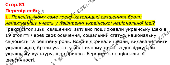 Перевір себе 1. Поясніть, чому саме греко-католицькі священики брали найактивнішу участь у поширенні української національної ідеї? Греко-католицькі священики активно поширювали українську ідею в 19 столітті через своє освічення, соціальний статус, національну свідомість та релігійну роль. Вони відкривали школи, видавали книги українською, брали участь у політичному житті та досліджували українську культуру, що сприяло збереженню національної ідентичності.