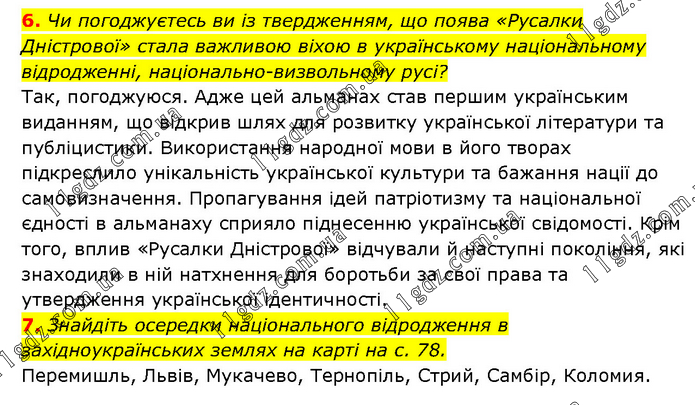 6. Чи погоджуєтесь ви із твердженням, що поява «Русалки Дністрової» стала важливою віхою в українському національному відродженні, національно-визвольному русі? Так, погоджуюся. Адже цей альманах став першим українським виданням, що відкрив шлях для розвитку української літератури та публіцистики. Використання народної мови в його творах підкреслило унікальність української культури та бажання нації до самовизначення. Пропагування ідей патріотизму та національної єдності в альманаху сприяло піднесенню української свідомості. Крім того, вплив «Русалки Дністрової» відчували й наступні покоління, які знаходили в ній натхнення для боротьби за свої права та утвердження української ідентичності. 7. Знайдіть осередки національного відродження в західноукраїнських землях на карті на с. 78. Перемишль, Львів, Мукачево, Тернопіль, Стрий, Самбір, Коломия.