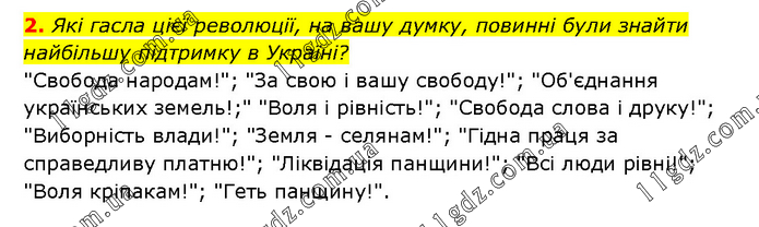 Які гасла цієї революції, на вашу думку, повинні були знайти найбільшу підтримку в Україні? "Свобода народам!"; "За свою і вашу свободу!"; "Об'єднання українських земель!;" "Воля і рівність!"; "Свобода слова і друку!"; "Виборність влади!"; "Земля - селянам!"; "Гідна праця за справедливу платню!"; "Ліквідація панщини!"; "Всі люди рівні!"; "Воля кріпакам!"; "Геть панщину!".