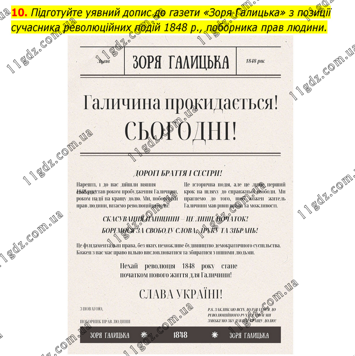 Підготуйте уявний допис до газети «Зоря Галицька» з позиції сучасника революційних подій 1848 р., поборника прав людини.