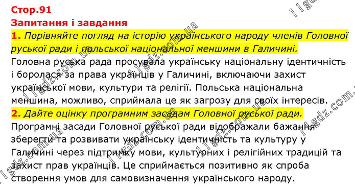 Запитання і завдання 1. Порівняйте погляд на історію українського народу членів Головної руської ради і польської національної меншини в Галичині. Головна руська рада просувала українську національну ідентичність і боролася за права українців у Галичині, включаючи захист української мови, культури та релігії. Польська національна меншина, можливо, сприймала це як загрозу для своїх інтересів. 2. Дайте оцінку програмним засадам Головної руської ради. Програмні засади Головної руської ради відображали бажання зберегти та розвивати українську ідентичність та культуру у Галичині через підтримку мови, культурних і релігійних традицій та захист прав українців. Це сприймається позитивно як спроба створення умов для самовизначення українського народу.