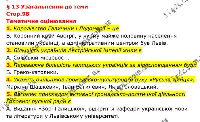 § 13 Узагальнення до теми Стор.98 Тематичне оцінювання 1. Королівство Галичини і Лодомерії – це Б. Коронний край Австрії, у якому майже половину населення становили українці, а адміністративним центром був Львів. 2. Більшість українців Австрійської імперії жили в А. Сільській місцевості. 3. Переважна більшість галицьких українців за віросповіданням були Б. Греко-католики. 4. Укажіть очільників громадсько-культурного руху «Руська трійця». Маркіян Шашкевич, Іван Вагилевич, Яків Головацький. 5. Вагомим прикладом активної громадсько-політичної діяльності Головної руської ради є А. Видання «Зорі Галицької», відкриття кафедри української мови та літератури у Львівському університеті.