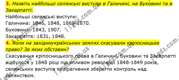 3. Назвіть найбільші селянські виступи в Галичині, на Буковині та в Закарпатті. Найбільші селянські виступи: Галичина: 1846, 1848, 1869-1870. Буковина: 1843, 1907. Закарпаття: 1831, 1848. 4. Коли на західноукраїнських землях скасували кріпосницьке право? За яких обставин? Скасування кріпосницького права в Галичині, Буковині та Закарпатті відбулося у 1848 році під впливом революції 1848-1849 років, селянських виступів та прагнення зберегти контроль над селянством.