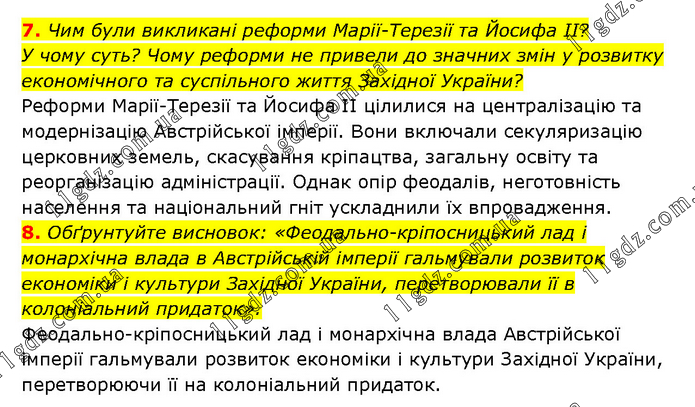 7. Чим були викликані реформи Марії-Терезії та Йосифа II? У чому суть? Чому реформи не привели до значних змін у розвитку економічного та суспільного життя Західної України? Реформи Марії-Терезії та Йосифа II цілилися на централізацію та модернізацію Австрійської імперії. Вони включали секуляризацію церковних земель, скасування кріпацтва, загальну освіту та реорганізацію адміністрації. Однак опір феодалів, неготовність населення та національний гніт ускладнили їх впровадження. 8. Обґрунтуйте висновок: «Феодально-кріпосницький лад і монархічна влада в Австрійській імперії гальмували розвиток економіки і культури Західної України, перетворювали її в колоніальний придаток». Феодально-кріпосницький лад і монархічна влада Австрійської імперії гальмували розвиток економіки і культури Західної України, перетворюючи її на колоніальний придаток.