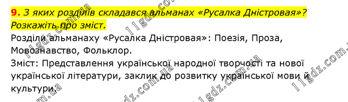 З яких розділів складався альманах «Русалка Дністровая»? Розкажіть про зміст. Розділи альманаху «Русалка Дністровая»: Поезія, Проза, Мовознавство, Фольклор. Зміст: Представлення української народної творчості та нової української літератури, заклик до розвитку української мови й культури.