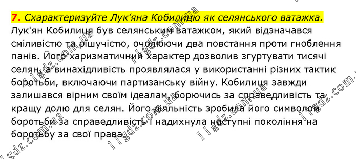 7. Схарактеризуйте Лук’яна Кобилицю як селянського ватажка. Лук'ян Кобилиця був селянським ватажком, який відзначався сміливістю та рішучістю, очолюючи два повстання проти гноблення панів. Його харизматичний характер дозволив згуртувати тисячі селян, а винахідливість проявлялася у використанні різних тактик боротьби, включаючи партизанську війну. Кобилиця завжди залишався вірним своїм ідеалам, борючись за справедливість та кращу долю для селян. Його діяльність зробила його символом боротьби за справедливість і надихнула наступні покоління на боротьбу за свої права.
