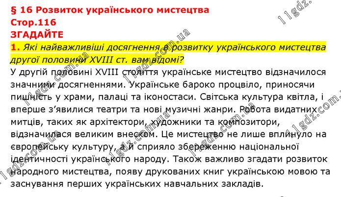 § 16 Розвиток українського мистецтва Стор.116 ЗГАДАЙТЕ 1. Які найважливіші досягнення в розвитку українського мистецтва другої половини XVIII ст. вам відомі? У другій половині XVIII століття українське мистецтво відзначилося значними досягненнями. Українське бароко процвіло, приносячи пишність у храми, палаці та іконостаси. Світська культура квітла, і вперше з’явилися театри та нові музичні жанри. Робота видатних митців, таких як архітектори, художники та композитори, відзначилася великим внеском. Це мистецтво не лише вплинуло на європейську культуру, а й сприяло збереженню національної ідентичності українського народу. Також важливо згадати розвиток народного мистецтва, появу друкованих книг українською мовою та заснування перших українських навчальних закладів.