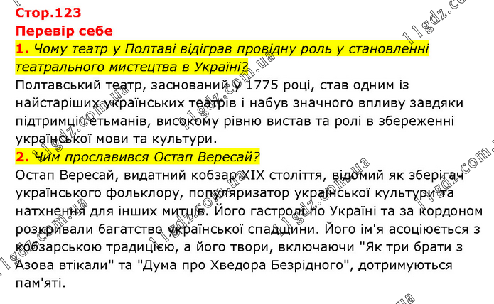 Перевір себе 1. Чому театр у Полтаві відіграв провідну роль у становленні театрального мистецтва в Україні? Полтавський театр, заснований у 1775 році, став одним із найстаріших українських театрів і набув значного впливу завдяки підтримці гетьманів, високому рівню вистав та ролі в збереженні української мови та культури. 2. Чим прославився Остап Вересай? Остап Вересай, видатний кобзар XIX століття, відомий як зберігач українського фольклору, популяризатор української культури та натхнення для інших митців. Його гастролі по Україні та за кордоном розкривали багатство української спадщини. Його ім'я асоціюється з кобзарською традицією, а його твори, включаючи "Як три брати з Азова втікали" та "Дума про Хведора Безрідного", дотримуються пам'яті.