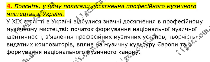 Поясніть, у чому полягали досягнення професійного музичного мистецтва в Україні. У XIX столітті в Україні відбулися значні досягнення в професійному музичному мистецтві: початок формування національної музичної ідентичності, з'явлення професійних музичних установ, творчість видатних композиторів, вплив на музичну культуру Європи та формування національного музичного канону.