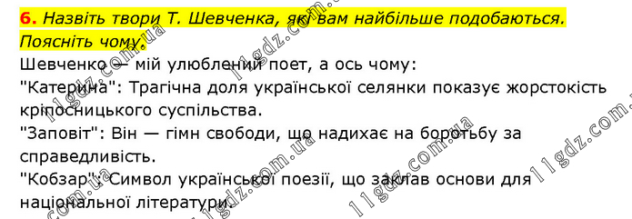 Назвіть твори Т. Шевченка, які вам найбільше подобаються. Поясніть чому. Шевченко — мій улюблений поет, а ось чому: "Катерина": Трагічна доля української селянки показує жорстокість кріпосницького суспільства. "Заповіт": Він — гімн свободи, що надихає на боротьбу за справедливість. "Кобзар": Символ української поезії, що заклав основи для національної літератури.