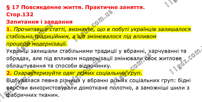 § 17 Повсякденне життя. Практичне заняття. Стор.132 Запитання і завдання 1. Прочитавши статті, визначте, що в побуті українців залишалося стабільно традиційним, а що змінювалося під впливом процесів модернізації. Українці залишали стабільними традиції у вбранні, харчуванні та обрядах, але під впливом модернізації змінювали своє житлове облаштування та способи відпочинку. 2. Охарактеризуйте одяг різних соціальних груп. Відбувалася певна різниця у вбранні різних соціальних груп: бідні верстви використовували домоткане полотно, а заможніші шили з фабричних тканин.