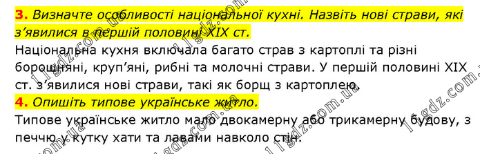 3. Визначте особливості національної кухні. Назвіть нові страви, які з’явилися в першій половині ХІХ ст. Національна кухня включала багато страв з картоплі та різні борошняні, круп’яні, рибні та молочні страви. У першій половині XIX ст. з’явилися нові страви, такі як борщ з картоплею. 4. Опишіть типове українське житло. Типове українське житло мало двокамерну або трикамерну будову, з печчю у кутку хати та лавами навколо стін.