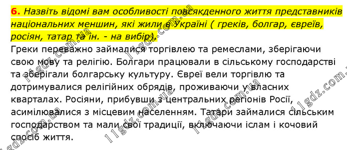 Назвіть відомі вам особливості повсякденного життя представників національних меншин, які жили в Україні ( греків, болгар, євреїв, росіян, татар та ін. - на вибір). Греки переважно займалися торгівлею та ремеслами, зберігаючи свою мову та релігію. Болгари працювали в сільському господарстві та зберігали болгарську культуру. Євреї вели торгівлю та дотримувалися релігійних обрядів, проживаючи у власних кварталах. Росіяни, прибувши з центральних регіонів Росії, асимілювалися з місцевим населенням. Татари займалися сільським господарством та мали свої традиції, включаючи іслам і кочовий спосіб життя.