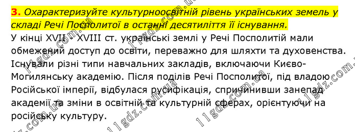 Охарактеризуйте культурноосвітній рівень українських земель у складі Речі Посполитої в останні десятиліття її існування. У кінці XVII - XVIII ст. українські землі у Речі Посполитій мали обмежений доступ до освіти, переважно для шляхти та духовенства. Існували різні типи навчальних закладів, включаючи Києво-Могилянську академію. Після поділів Речі Посполитої, під владою Російської імперії, відбулася русифікація, спричинивши занепад академії та зміни в освітній та культурній сферах, орієнтуючи на російську культуру.