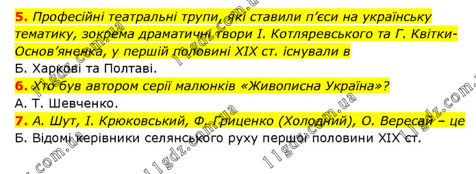 5. Професійні театральні трупи, які ставили п’єси на українську тематику, зокрема драматичні твори І. Котляревського та Г. Квітки-Основ’яненка, у першій половині ХІХ ст. існували в Б. Харкові та Полтаві. 6. Хто був автором серії малюнків «Живописна Україна»? А. Т. Шевченко. 7. А. Шут, І. Крюковський, Ф. Гриценко (Холодний), О. Вересай – це Б. Відомі керівники селянського руху першої половини ХІХ ст.