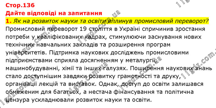 Дайте відповіді на запитання 1. Як на розвиток науки та освіти вплинув промисловий переворот? Промисловий переворот 19 століття в Україні спричинив зростання потреби у кваліфікованих кадрах, стимулюючи заснування нових технічних навчальних закладів та розширення програм університетів. Підтримка наукових досліджень промисловими підприємствами сприяла досягненням у металургії, машинобудуванні, хімії та інших галузях. Поширення наукових знань стало доступнішим завдяки розвитку грамотності та друку, організації лекцій та виставок. Однак, доступ до освіти залишався обмеженим для багатьох, а нестача фінансування та політична цензура ускладнювали розвиток науки та освіти.