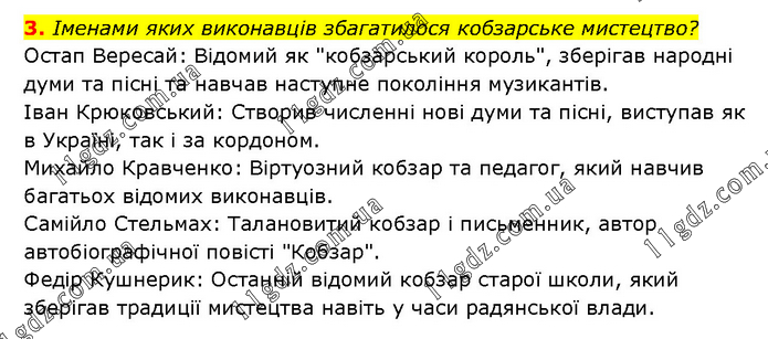 Іменами яких виконавців збагатилося кобзарське мистецтво? Остап Вересай: Відомий як "кобзарський король", зберігав народні думи та пісні та навчав наступне покоління музикантів. Іван Крюковський: Створив численні нові думи та пісні, виступав як в Україні, так і за кордоном. Михайло Кравченко: Віртуозний кобзар та педагог, який навчив багатьох відомих виконавців. Самійло Стельмах: Талановитий кобзар і письменник, автор автобіографічної повісті "Кобзар". Федір Кушнерик: Останній відомий кобзар старої школи, який зберігав традиції мистецтва навіть у часи радянської влади.