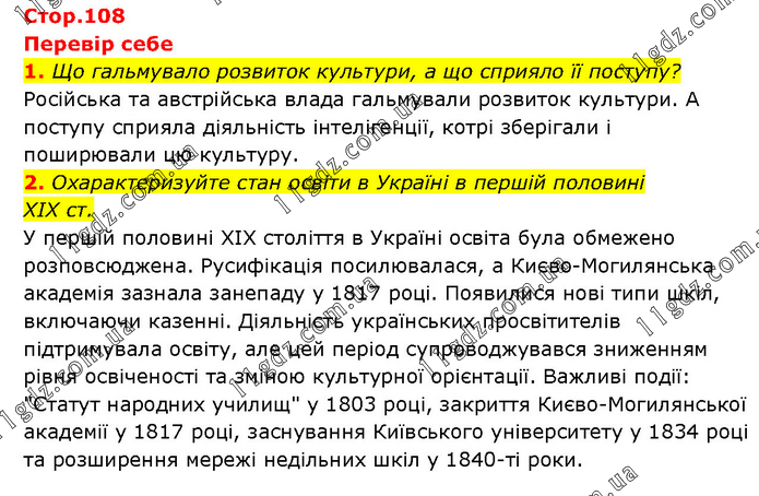Перевір себе 1. Що гальмувало розвиток культури, а що сприяло її поступу? Російська та австрійська влада гальмували розвиток культури. А поступу сприяла діяльність інтелігенції, котрі зберігали і поширювали цю культуру. 2. Охарактеризуйте стан освіти в Україні в першій половині ХІХ ст. У першій половині XIX століття в Україні освіта була обмежено розповсюджена. Русифікація посилювалася, а Києво-Могилянська академія зазнала занепаду у 1817 році. Появилися нові типи шкіл, включаючи казенні. Діяльність українських просвітителів підтримувала освіту, але цей період супроводжувався зниженням рівня освіченості та зміною культурної орієнтації. Важливі події: "Статут народних училищ" у 1803 році, закриття Києво-Могилянської академії у 1817 році, заснування Київського університету у 1834 році та розширення мережі недільних шкіл у 1840-ті роки.