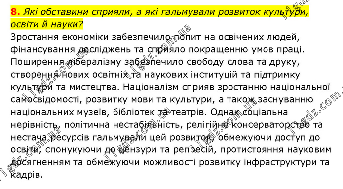 Які обставини сприяли, а які гальмували розвиток культури, освіти й науки? Зростання економіки забезпечило попит на освічених людей, фінансування досліджень та сприяло покращенню умов праці. Поширення лібералізму забезпечило свободу слова та друку, створення нових освітніх та наукових інституцій та підтримку культури та мистецтва. Націоналізм сприяв зростанню національної самосвідомості, розвитку мови та культури, а також заснуванню національних музеїв, бібліотек та театрів. Однак соціальна нерівність, політична нестабільність, релігійне консерваторство та нестача ресурсів гальмували цей розвиток, обмежуючи доступ до освіти, спонукуючи до цензури та репресій, протистояння науковим досягненням та обмежуючи можливості розвитку інфраструктури та кадрів.