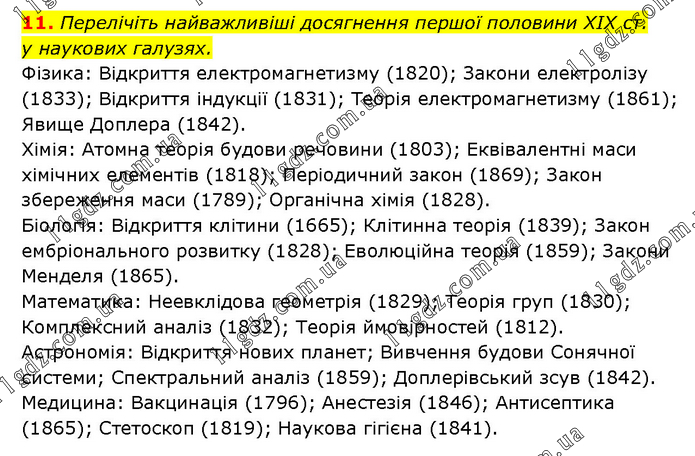 Перелічіть найважливіші досягнення першої половини ХІХ ст. у наукових галузях. Фізика: Відкриття електромагнетизму (1820); Закони електролізу (1833); Відкриття індукції (1831); Теорія електромагнетизму (1861); Явище Доплера (1842). Хімія: Атомна теорія будови речовини (1803); Еквівалентні маси хімічних елементів (1818); Періодичний закон (1869); Закон збереження маси (1789); Органічна хімія (1828). Біологія: Відкриття клітини (1665); Клітинна теорія (1839); Закон ембріонального розвитку (1828); Еволюційна теорія (1859); Закони Менделя (1865). Математика: Неевклідова геометрія (1829); Теорія груп (1830); Комплексний аналіз (1832); Теорія ймовірностей (1812). Астрономія: Відкриття нових планет; Вивчення будови Сонячної системи; Спектральний аналіз (1859); Доплерівський зсув (1842). Медицина: Вакцинація (1796); Анестезія (1846); Антисептика (1865); Стетоскоп (1819); Наукова гігієна (1841).