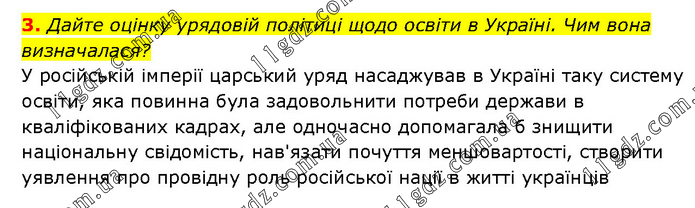 Дайте оцінку урядовій політиці щодо освіти в Україні. Чим вона визначалася? У російській імперії царський уряд насаджував в Україні таку систему освіти, яка повинна була задовольнити потреби держави в кваліфікованих кадрах, але одночасно допомагала б знищити національну свідомість, нав'язати почуття меншовартості, створити уявлення про провідну роль російської нації в житті українців